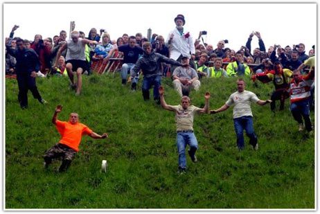 Нет-нет, это не опечатка. Каждый год в Великобритании, в Глочестере, народ собирается на склоне холма, и сырных дел мастер спускает сырную головку с холма. Та катится очень быстро, это понятно – а куча народу старается угнаться за непокорной головкой сыра. В принципе, более-менее спортивно. Теперь это – официальный вид спорта (хорошо, хоть на Олимпийских играх пока еще не гоняются за сыром).